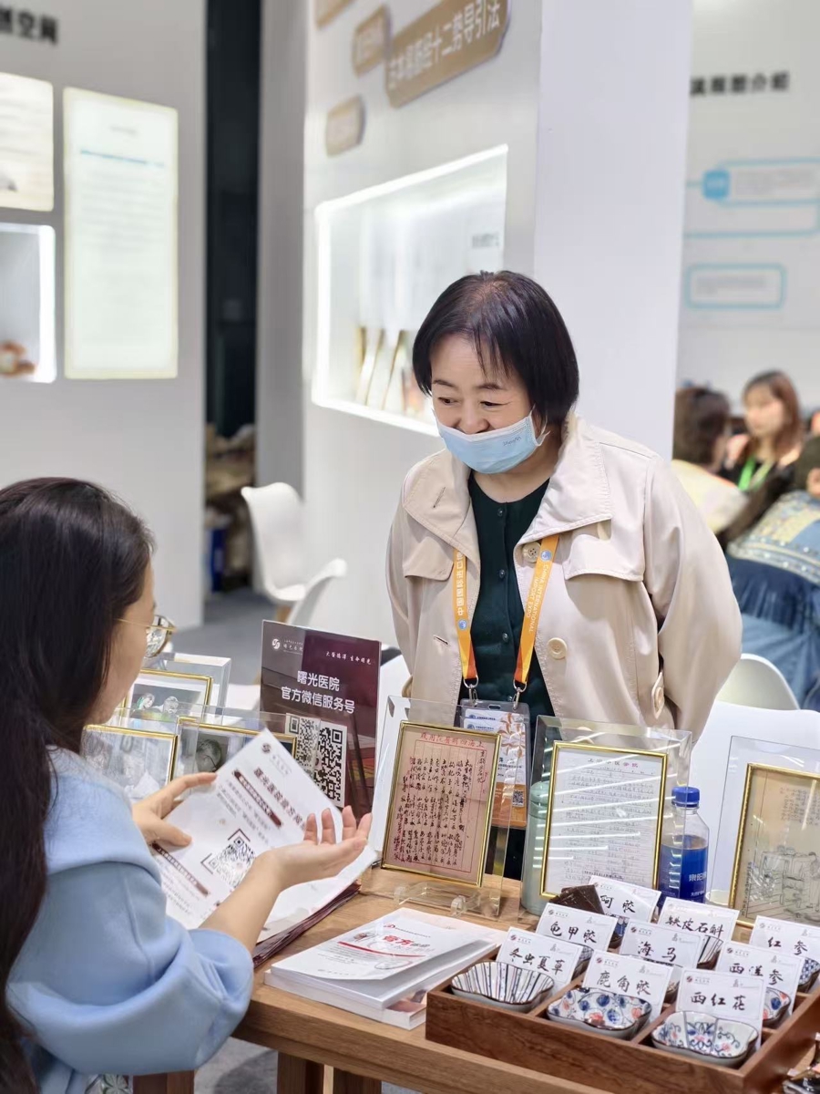 在非物质文化遗产展示专区N4展台前,石氏伤科第五代嫡系传人、上海中医药大学附属曙光医院主任医师石瑛、石氏伤科主治医师熊轶喆,为观众详细讲解“密骨胶囊”、“养血软坚胶囊”等石氏伤科自制制剂的组方思路,从经典中药配伍逻辑讲到现代临床应用价值,让每款药品的研发脉络清晰可感。